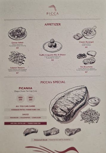 Read moreWent here at noon, we were like "it usually takes reservation to be able to eat here so if it's full, let's go some places nearby" but our luck, there were places for two. The waitress upfront was so cordial, so thus the way the waiters and waitress inside. The place is not too big (enough for 30/35 people) and it shares places with some more tenants. Picca is located at the left front side. The interior is like steakhouses in general, with tables lined up with paper tablecloth above the linen one for easy cleaning. Since it's lunch hour, we were given 90 minutes for seating time (incl time waiting for the food). Ample time it was, since we share a plate of mb7 (they ran out of mb5), seasonal menu of scallop plates (they were so so, I'd not recommend it) and tiramisu for dessert. The steak was quite good (make sure you order medium rare or rare since it got chewy once it cooled down). The free flow fries are good!! (Thank you Adam for the cordial service and mng Harris for the free takeaway seasoned fries, appreciate it!!) We had fun dipping them in the tiramisu cream (my taste hahaha), as some fries are soft and some are hard so the hard one gets dipped in cream. The tiramisu is viscous, so a plate is definitely enough for two people. They served it to you with a performance (sort of?) As in they took the container it was made in, cut one sixth with a large spoon and placed it on a smaller plate in your table. Then they made it raaaining chocolate powder on the tiramisu. All in all, it was quite a nice experience eating in a place you found on google maps and finding it up to your...