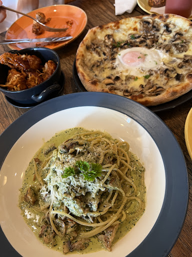 The restaurant is located in a spacious and modern setting, with exposed brick walls and a large open kitchen where customers can watch their pizzas being made from scratch. The menu features a wide variety of pizzas, pastas, and other Italian dishes, all made with fresh, locally-sourced ingredients.