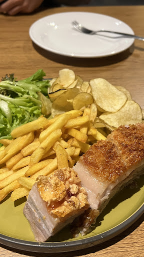 I tried the pork belly (small) which comes with salad, fries & homemade potato chips, and honestly, every part of the plate was so good. The pork belly is super crisp, exactly how it should be. You can even ask for your preferred cut: go with thin slices if youâre into that melt-in-your-mouth fat, or thick if you want it meatier and leaner. Love that they give you the option.