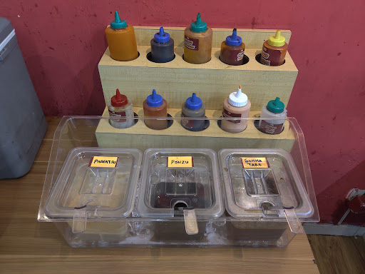 Makanan!! Pilihan daging nya cukup bervariasi, standar nya AYCE. Kalau saya tidak salah, kayaknya ada ikan juga deh, potongan nya kotak gitu (tolong dikoreksi kalau salah) Tidak menyediakan air mineral, ada lemari es isinya air putih, tapi kayaknya bayar. Karena ruangan terbuka, kompor jd kena hembusan angin, membuat daging jd lama mateng nya, khususnya saat hujan angin (pas saya dateng lg kondisi hujan) Ada ice cream, sebuah poin plus dari saya, walau eskrim Aice, tp enak. Untuk scoop es krim nya, tolong disediakan tempat khusus, karena orang habis ambil es krim naro scoop nya berantakan, jd lengket scoop nya. Miso sup nya hambar Disediakan side dish jamur krispi, saran saya jgn diambil kalau mau makan daging banyak, karena jamur nya berminyak, membuat kita cepet eneg dan kenyang. Pilihan saus cukup beragam. Minum nya ada: Thai dan Green tea, teh tawar dan manis, lemon tea. Tipikal resto all you can eat yg tidak menyediakan air putih, jd konsumen lebih cepat kenyang dan perut terasa penuh karena minuman manis.