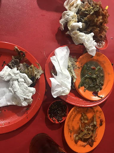 Kerang dara (terlalu besar2, jadi isi seporsi sedikit, kematengan ok, sambel kurang berasa terasinya atau apa lah itu) Udang saos padang (enak karna pedas dan porsi yang cukup untuk berdua, tapi saos dan rasa masih kurang medok/ kurang tajam, agak sedikit plain) Ikan bisa pilih sesuai ketersediaan Gurame bakar (kematengan cukup, porsi ukuran cukup untuk berdua atau bertiga, tapi untuk bumbu masih juga kurang tajam alias tawar, kurang meresap dan terasa pahit karna terasa bagian yang gosong, kecuali jika di cocol sambel kecap) Cah kangkung (porsi yang cukup berdua juga, tapi lagi-lagi kurang medok, alias kurang berasa asin / kurang terasi) 3 Nasi uduk (ini yang enak, uduknya berasa, mantul) Mineral dan teh tawar