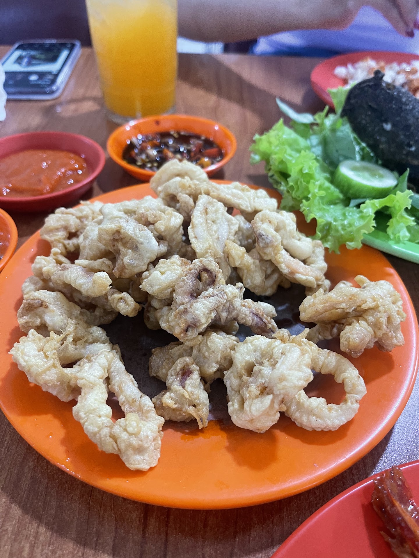 Menu yang gue pesan sih standar: udang goreng tepung, cumi saus tiram, kangkung tauco seafood, dan terakhir kerang ijo goreng. Tapi yang bikin beda itu pelayanannya. Begitu duduk, langsung disajikan aneka sambal dan saus buat cocolan—ada sambal bawang, saus sambal bawang khusus kerang, sampai sambal kecap—padahal gue gak pesen. Detail kecil tapi berasa banget effort-nya. Oya, semua makanan di sini freshhhh banget, gak amis pula.