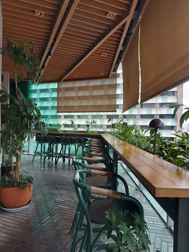 Ambience & Interior It features a spacious layout split into main dining, lounge, and bar / winepost / wine display areas. Design elements lean toward industrial chic + natural touches: wood (timber panels, wooden furniture), exposed concrete or steel, and accents of greenery or “soft” elements to balance the raw materials.