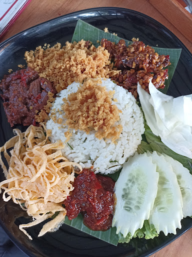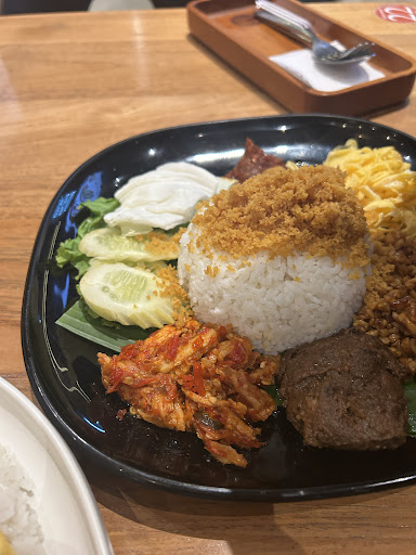 they have some rice dishes for the base menu. nasi rames jeruk is basically a steamed rice with orange zest, served with sliced scrambled eggs, stir-fried tempe, and chili sambal. you can add side dishes like empal suwir pedas, which is shredded spicy beef jerky.