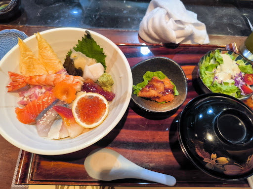 Sashimi don (5/5) It had several sashimi, eggs, pickles with real wasabi (not the usual fake wasabi we have been used to). It was the first time I ate sushi/sashimi with a real wasabi and I'm very surprised that it's very mild in comparison with the usual wasabi. The sashimi include shrimp, minced tuna, salmon, mackerel, mekajiki, unagi (cooked), ikura. Every single piece is very fresh and tasty, with no tainting fishiness at all. I loved it. The pickles are refreshing and there's kombu pickle that had strong umaminess, the bowl was a delight.