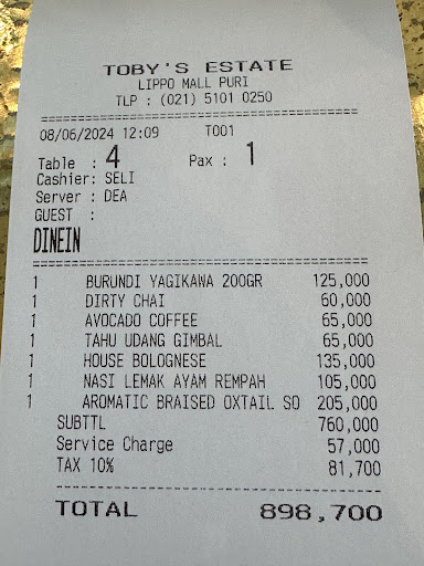 We decided to go Toby's Estate at Lippo Mall and were not disappointed. It was busy but we still managed to find a seat and the service was quite quick. Decided to try the Broadway Style Eggs Benedict and it was quite delicious and filling , the brioche was soft and flavourful. The cappuccino was just right as asked for it to be extra hot and they did a good job of making nice and hot and the bitterness of the coffee was just right as you could taste it and made it more enjoyable. We ended up going to Toby's Estate on two different days and they were still very good on the other day that we went. The second time had the Club Sandwich with fries and this turned out to nice and filling and the fries were nice and crunchy and enjoyable. Whenever I go to some place new like to try the Eggs Benedict and see how they compare back home or if they are better and it turned out the Eggs Benedict were just as nice as compared to back home. If you have a chance go try Toby's Estate at Lippo Mall and decided for yourself whether it is worthwhile or not. The other good thing was that there was outdoor seating also if you wanted to...