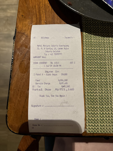 Akhirnya ku pilih yang express black angus B, sama tax & service di itung-itung per orang kena 240k-an. Hampir sejuta ber-4, tapiiiiii aku amat sangat kecewa, bahkan aku sampe ngga enak hati sama suami ku, karena ini kali pertama suami ku makan di sini, aku bangga-banggain Tucano banget depan suami ku dari dulu (karena tiap ke Tucano aku bareng temen belum pernah bareng suami) ku bilang pokoknya kamu harus ke Tucano ya! Enak banget blablabla pas suami ku makan mukanya sepet banget wkakak ini berlaku untuk semuanya ya, dagingnya HAMBAR, harus di cocol saos dulu baru ada rasanya, kalo di Senayan City ngga gini, saos ngga aku sentuh saking di makan gitu aja udah enak banget. Boleh scroll profile aku deh di PergiKuliner, aku kasih hampir bintang 5 untuk yang di Senayan City. Terus ALOT! Penyajiannya LAMAAAAA banget yang di sini tuh.