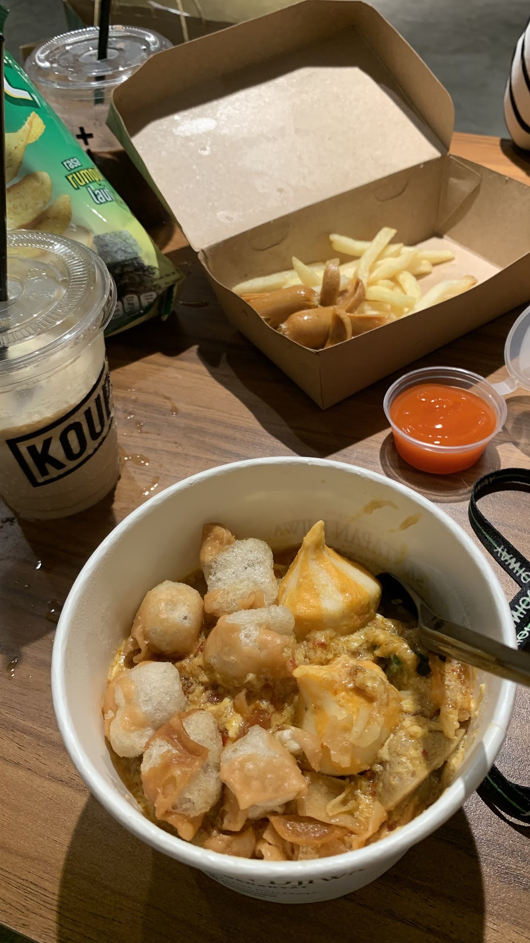 Read morepertama kali kesini ternyata ada beberapa tenant, pas baru naik tangga itu ada santapan djiwa, makanannya lumayan enak, aku pesen seblaknya ternyata enak wkwk terus chicken wingsnya menurutku biasa aja karena gaada rasanya, cireng lumayan enak tapi keras, terus naik tangga lagi itu ada tenant koup, mereka jual minuman kopi dan dessert nya menurut ku dikit bgt sih, gaada snack lain gitu, kopinya lumayan juga, yang vanilla coffee cream itu best sih menurutku, saran dari aku coba jual air mineral dingin dong :( overall oke, kalo mau wfc juga oke karna ada colokan, ga bisa ke rooftopnya karena ga kebagian tempat...