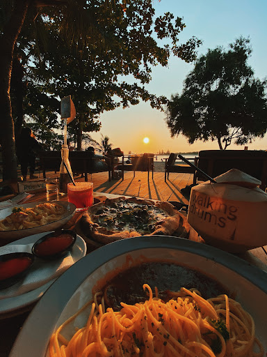 One thing to note is that unlike most restaurants where you eat first and pay later, you have to pay first here—probably because it’s an open space. If you’re coming, it’s best to use public transport or Grab to avoid paying the entrance fee for the area. The view in the evening is beautiful, though one of my friends mentioned there’s a strong, somewhat fishy smell in the air. It’s not a beachy, sticky vibe, though, so it’s still comfortable.