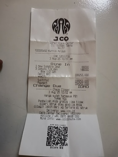 Ā Ā Ā Read moreHari ini 3 agustus 2025 saya beli 18 pcs donat di jco dan saya minta dibuat menjadi 3 box. Setelah nomor antrian saya dipanggil saya langsung ke kasir untuk membayar pesanan saya, tapi saya kaget ketika kasir bilang total pesanan saya 280rb an karena yg saya liat di menu satu pcs donat hanya 10rb an artinya jika saya beli 18 pcs total nya 180rb an. Kemudian kasir menawarkan potongan harga sekitar 30rb an tanpa pikir panjang langsung saya iyakan tawaran kasir tersebut, dan setelah melakukan pembayaran saya dikasih 3 bungkus kopi yg mana saya kira itu adalah gratis. Tapi setelah saya lihat struk ternyata benar 18pcs donat hanya 180rban dan 3 bungkus kopi ternyata dikenakan biaya 66rb akhirnya saya bayar 252rb. Saya tanyakan kepada kasir kenapa di struk ada pembelian kopi sachet sedangkan saya tidak memesan kopi tersebut lalu kasir menjelaskan dengan istilah2 kasir yg saya tidak bisa pahami sbg org awam. Karena saya malas berdebat panjang lebar saya iyakan saja penjelasan kasir tsb. Jujur ini pengalaman pertama yg tidak nyaman bagi saya. Mohon di tanggapi pihak jco ini memang harga nya seperti itu atau...