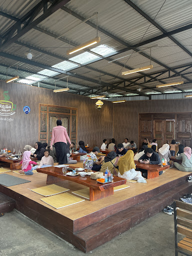 Ruangan cukup besar, adanyg lesehan atau meja/kursi.