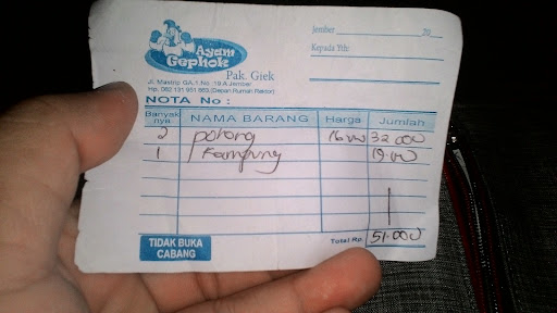 Read moreThe legendary culinary experience in Jember. Ayam Gephok Pak Giek offers you big delicious fried chicken, cooked with special and secret rempah-rempah or ingredients. Get one person serving just for IDR 16.000. So far it's the best traditional style of fried chicken in Jember.