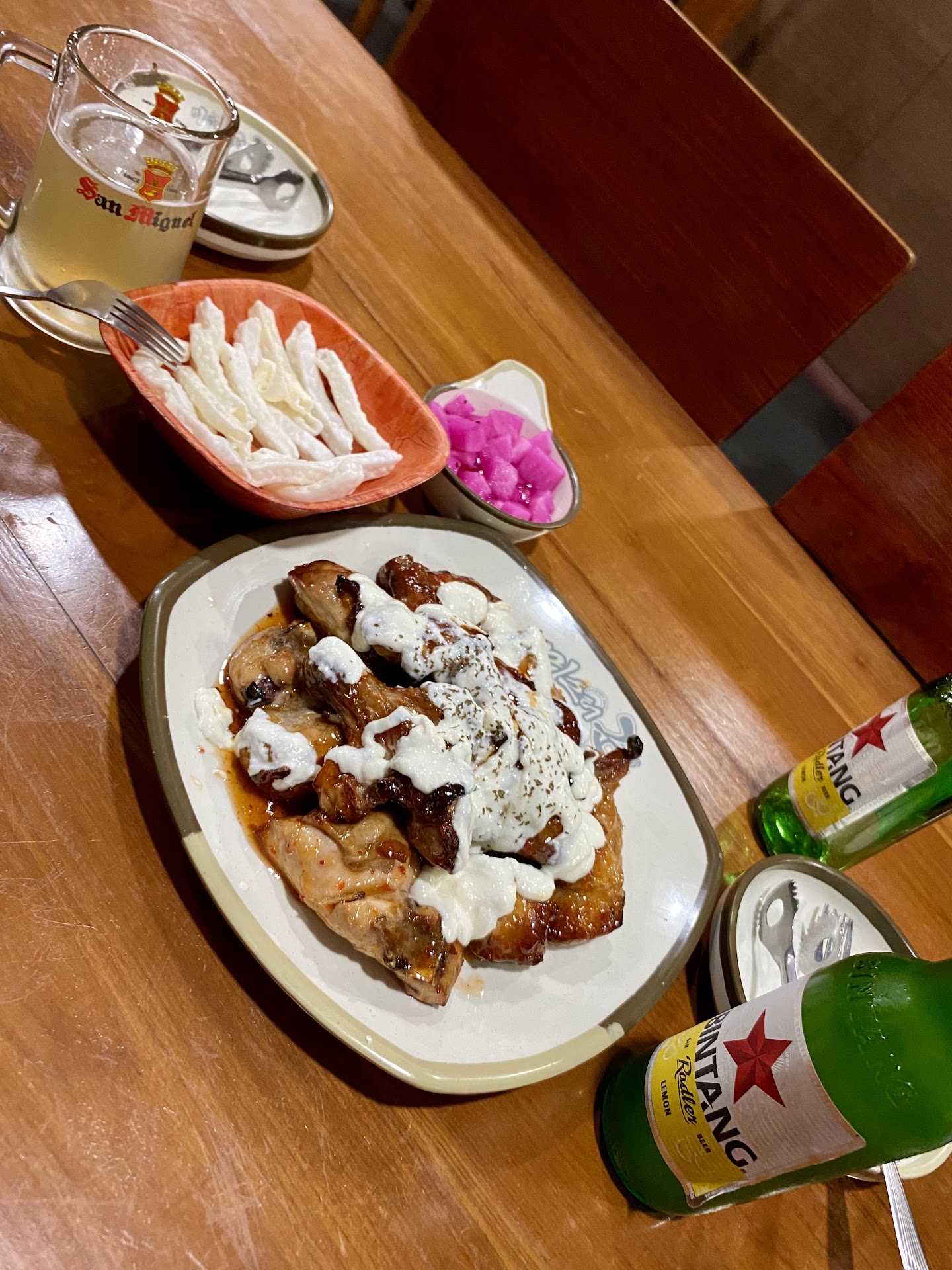 The food impressed me, especially the chicken with cheese (though I canโt recall the exact name??) Itโs a big portion that can easily feed 4-5 people and tasted delicious. They also provide snacks and radish as condiments, but surprisingly, there's no kimchi :/
