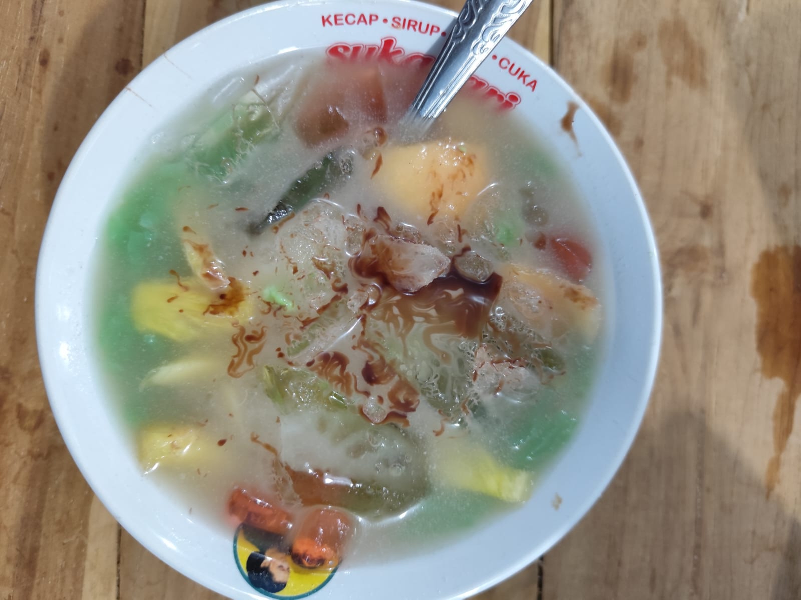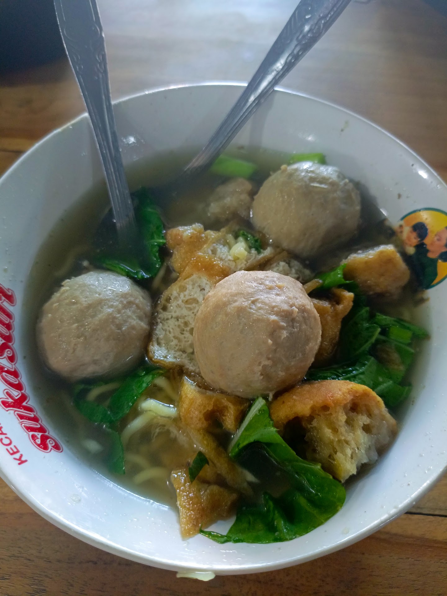 Bakso komplit 1 porsi isiannya ada 3 bakso polos, 1 bakso goreng, mie telur, dan sawi sedikit. Rasa baksonya enak, teksturnya lembut dan empuk, bukan yang daging banget tapi nggk rasa tepung juga, kuahnya gurih dan enak dimakan polosan.