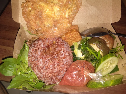 Waktu saya pesan nasi putihnya habis, jadi nasi merah putihnya berganti menjadi nasi merah merah. Dalam seporsi nasi tempong telur krispi ini terdiri dari nasi merah putih, terong rebus, jipan rebus, bayam rebus, sawi putih rebus, tahu goreng, tempe goreng, ikan asin, telur krispi dan sambel terasi mentah yang menggelegar pedesnya 😂 udah pedes, dikasihnya banyakkk lagi