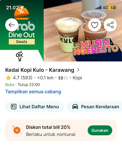 Ā Ā Ā Read moreSalah satu tempat ngopi terbaik di kota karawang, berlokasi di galuh mas. Di depan toko kulo ada juga yg jual bakso dan cemilian kekinian ayam kriuk kriuk. Didalam ruangan agak pengap, utk cashier dan mesin kopi nya tertutup jadi keliatannya jelek dan sempit. Tpi didalam ruangan itu ada lagi ruangan smoking area dan ada AC nya juga, mejanya ada 5-6. Di outdoor ada 2-3 meja. Mending banyakin outdoor biar nongkrong malam agak santai...