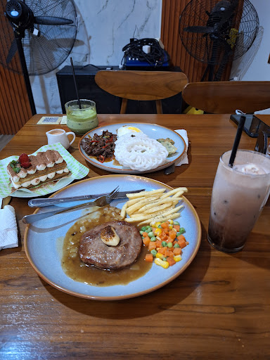 Read moreSaat datang lihat parkiran motor hampir penuh, ternyata di dalamnya masih ada tempat duduk, bahkan beberapa masih kosong. Bisa dibilang penataan tempatnya cukup bagus sehingga bisa menampung banyak orang di space yg tidak begitu luas. Kami duduk di bagian indoor, tempatnya sangat adem, bahkan agak dingin, dan terasa private untuk di indoor ini. Makanannya sangat enak menurut saya. Menurut saya, ini termasuk cafe yg "serius" dengan rasa masakannya, jd tidak hanya per-kopi-an yg ditonjolkan. Minumannya pun enak dengan rasa manis yang masih nyaman, tidak berlebihan. Sehingga tidak terasa over sweet meskipun kita pesan dessert jg. Overall cukup bagus, hanya mungkin untuk kecepatan penyajian bisa lebih ditingkatkan. Terbayar sih, dengan rasa masakannya yg enak dan penantiannya masih dapat dimaklumi karena kami datang saat malam minggu yg memang cenderung ramai.