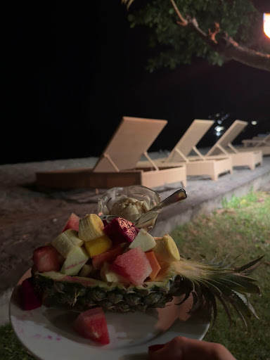 We had the pork rendang, which was delicious, and for dessert, we shared the pineapple boat filled with fresh fruits, ice cream, and a touch of liquor, absolutely delightful.