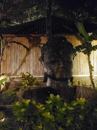 Beautiful setting with color changing lights in the pool at night, a giant statue head fountain, and gorgeous art work at some of the tables.