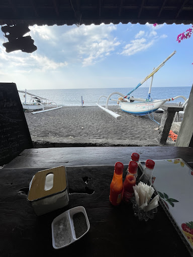 I came because of the favourable reviews on the beach. I was expecting a large beach scene with a large seating area like many of the busier noisier warung’s 200m east. I was pleasantly surprised by it’s smallness w maybe 10-11 tables, the open row of sun shaded trees separating it before an empty beach full of local fisherman boats pulled up after bringing in their 8am catches of the day. At 3pm I had this gem, any table, the beach & views all to myself. My kind server carried over the menu of the day on a leaning chalk board.