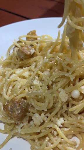 This warung is run by a bapak & ibu (not sure if theyâre a couple or not). They always welcomed me with kindest smile. Food portion is generous, reasonably priced & SUPER yummy! I had this delicious carbonara spaghetti! As I donât eat meat, I asked the bapak if he could replace it with tempe (itâs not on the menu). He did it wonderfully! Never in my life I had such delicious tempe, goes incredibly well with spaghetti carbonara cooked to perfection. He surely did some magic with the tempe there. He didnât just toss raw tempe inside, he mustâve put some delicious seasonings only for tempe before mixing it with spaghetti. I also keep coming back for their fresh fruit juice! Very reasonably priced, fresh, delicious, pure fruit.