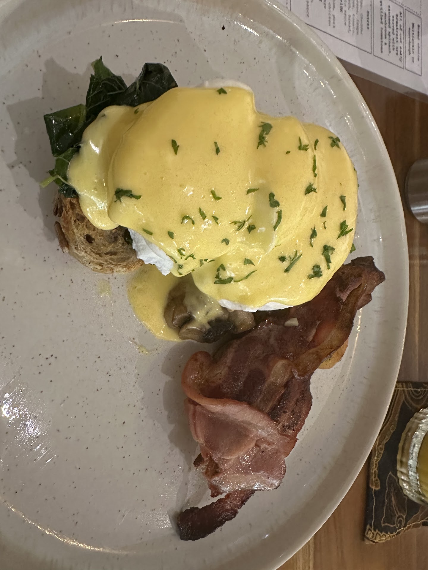 The coffee was just ok - my double espresso was over-extracted (too long) and bitter, but grateful that they served oat milk. Fresh fruit juices beautiful! Pop music extremely annoying and unnecessary - rather than adding to the atmosphere, it destroyed it for us. Actually quite unbearable. Lovely little retail section with some clothes etc with their own branding. Eggs Benedict was ok - hollandaise was bland but the multi-grain bread was really lovely! Avoid the stodgy pancakes - quite extraordinary to somehow mess that up but they did. Nothing arrived together - big wait between each dish arriving - adults finished eating by the time kids...