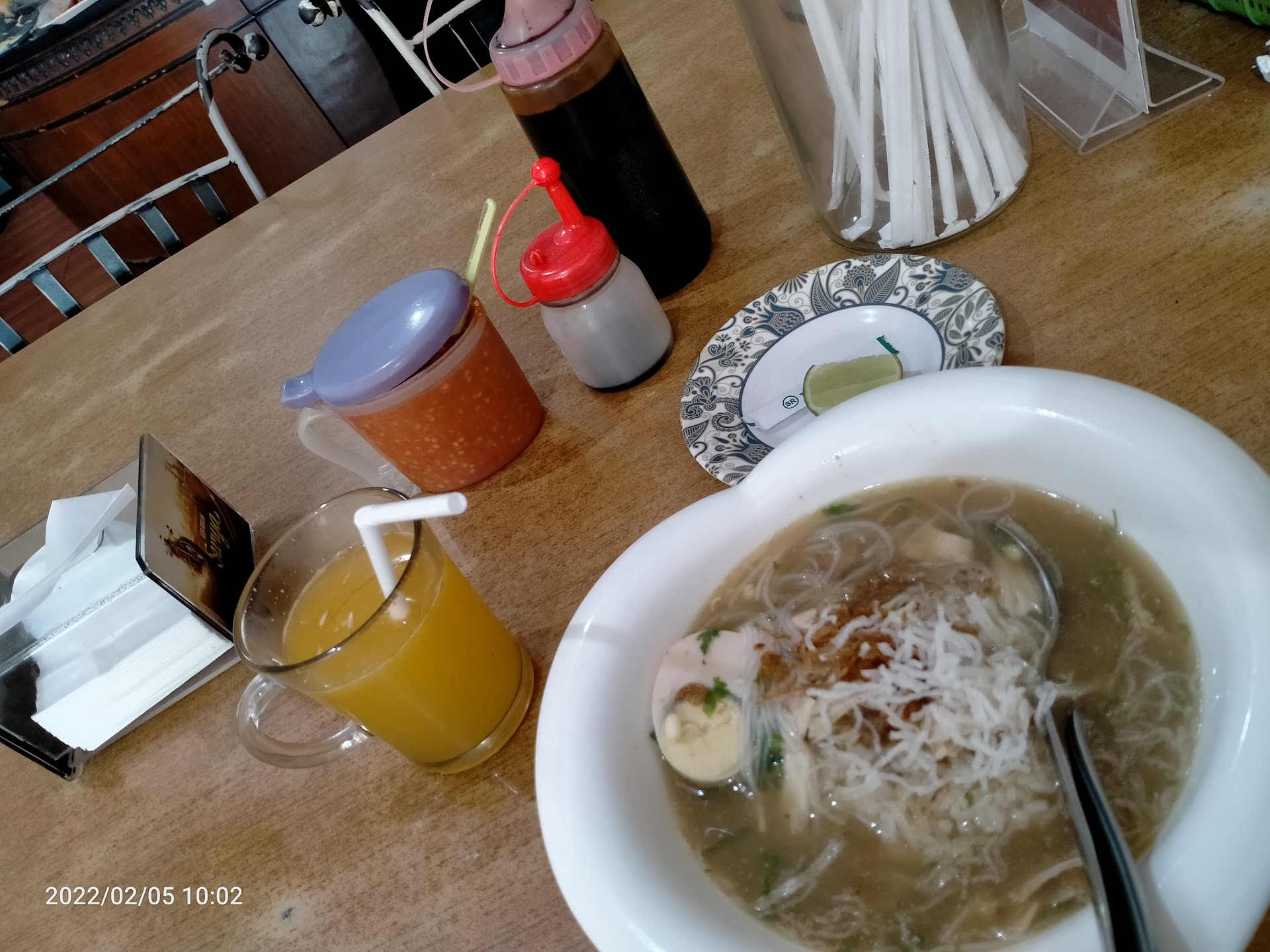 Gak pake lama pesanan diantar ke meja. Ada tambahan irisan jeruk nipis & tusuk gigi. Kuah sotonya encer, ga ada santan, warna juga bukan kuning kayak biasanya. Sueger rasanya. Suwiran ayam juga banyak banget. Ada irisan separo telur rebus. Karena sarapan di jam nanggung, terpantau belum serame biasanya. Aman, bisa healing sejenak 😂