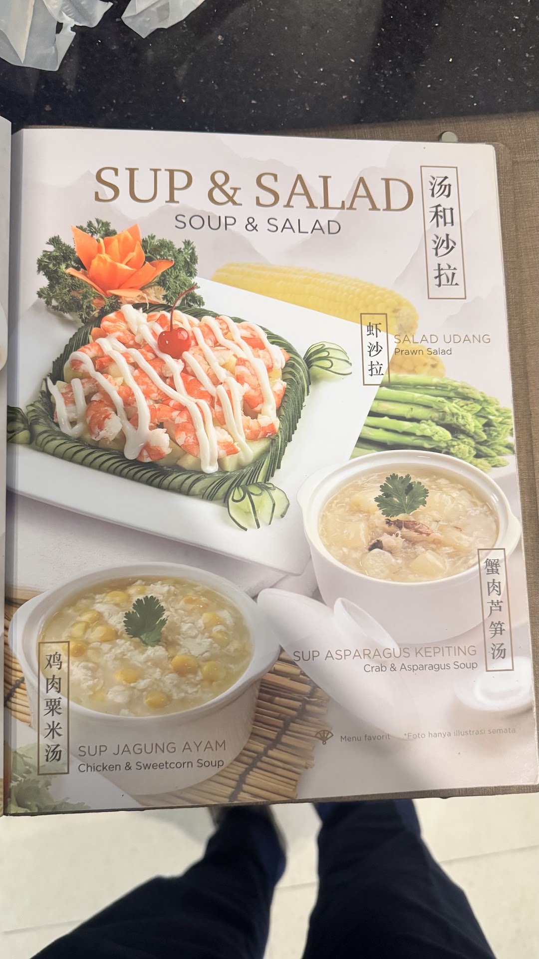 The dishes are just normal, nothing special for the taste. I ordered gurame asam manis but its seem just not good as the appearance, because the fish still in smell of mud (bau lumpur). And the other food birthday fried noodles are nice and taste good, the asparagus soups are so delicious and the steamed chicken with garlic (the legend) are good enough, the skin so tasty but after the skin the taste just ordinary and the last menu is lindung cah fumak, the taste is good but unfortunately the lindung so crispy,