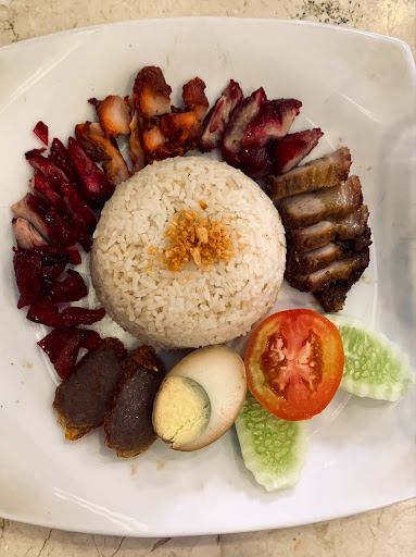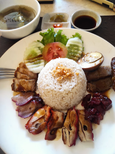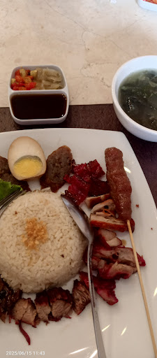 Read moreLokasi pas disebrang kiri pasar bersih sinpasa. Parkir mobil bisa dimana aja. Saat datang sdh disambut dgn wanginya sate babi yg terbakar 🤤. Ini resto non halal ya.... All about pork...yess!! Banyak pilihan menu...nasi atau mie...bubur juga ada. pelayanannya ramah...sy makan dilantai 1...mungkin jika pengunjung penuh, lantai 2 dibuka. Toilet ada di lt 2. Oh ya...disini kita sambil menunggu orderan datang, bisa ngemil krackers babi ( kulit, usus) free, ada di tiap meja didalam toples. Diatas meja sdh disediakan bbrp bumbu tambahan spt.. cabe potong, sambel cabe giling, saus nasi hainan, kcp asin, kcp manis, lada...sayang ga ada chili oil. Pertama pelayan mengirim mijuman beserta sendok garpu dlm gelas stainless yg berisi air panas. Saat dtg sy order nasi hainan campur special. Bedanya dgn yg biasa cuma diporsinya dan selisih harga goceng aja (65/60 ribu). Isinya komplit... Nasi hainan dgn taburan bwg pth goreng ditemani telur pindang (stgh), babi panggang kering(asin), bapang manis (carsiu), ayam carsiu, yencien, sate manis babi, satu lg spt ngohiong tp sy ga tau namanya...Plus sayur asin di mangkok terpisah. Semua rasanya pas, mantab, sayur asinnya juga mantan...krg asem dikiiiitt. Saya juga order mie ayam pek cam keh...mie ditemani potongan ayam rebus plus kuah terpisah....sayang ini kurang bumbu...agak krg sedap...mgkn lrn temanya pek cam keh 😁. Over all...