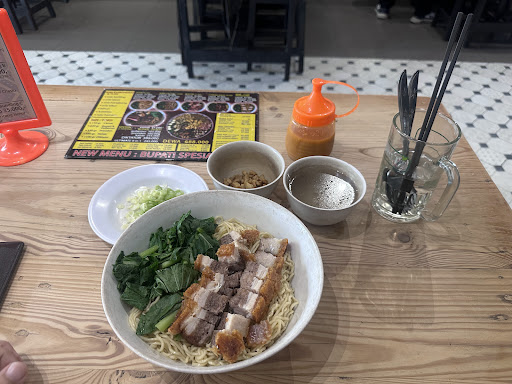What a generous amount of toppings portion for a reasonable price! All of their noodle menus are basically customisable. So first you choose the noodle type, then you select the toppings. I ordered the Special one, it has all the necessary toppings in one bowl: chicken, minced pork, crispy pork belly, chasiu pork and bacon. Their favourite noodle is ‘mie keriting’, it’s thin, flat-ish and curly looking, hence the name, but I picked the ‘mie karet’, it’s thicker and has rubbery texture much like old skool noodles. You can add or even buy the toppings separately. If this is your first time, I suggest just ordering the Special, like I did, so you get the overall taste of every important items they have lol. The taste of the toppings are fine mostly, except for the chicken, which is a bit dry and chewy, the rest are okay but I liked their bacon, chasiu pork and crispy pork belly. Don’t be fooled by the portion, it might look small but quite filling, especially since I ordered the thicker and rubbery noodle. Overall this place is...