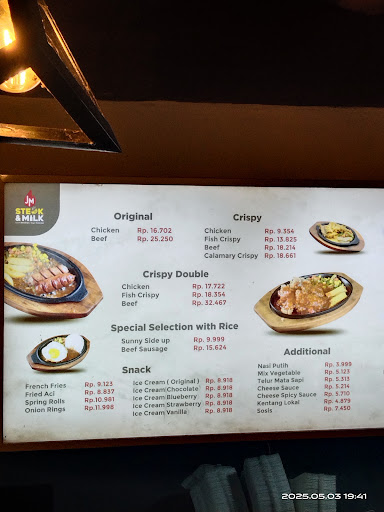Read moreSaya sudah lama pengen steak and milk, saya datang sama suami saya hari Sabtu 8 Maret 2025, saya pesen 1 Nasi 1 Beef crispy 1 chiken doubel 1 lemon tea 1 fresh tea 1 French fresh 1 Fresh milk Saya pesen untuk berbuka puasa, pesen jam 17.34, minuman datang, minuman datang 18.15 dan makanan datang 19.30 udah hampir 2 jam, waktu saya bilang kak makanan belum yah saya no 10 sudah belum sudah 2 jam menunggu, itu cuma ngasih respon sabar yah kak, terus saya di cuek i, tidak ada jawaban lagi, temennya bilang no 10 berapa lama itu temennya tidak merespon dan staf kasir nya ambil kentang yang buat customer itu dimakan di depan saya sambil senyum" apa itu sopan? Kita pembeli kita raja kenapa asal ambil kalau mau berbuka tidak ambil makanan buat customer, terus rasa kentang hambar tidak ada rasa gurih sama sekali, French fresh asin banget, buat beef crispy sumpah itu alot banget gak bisa dimakan, rasa chiken doubel lumayan tpi citra rasa bumbunya kurang, buat saosnya sumpah zonk enggak enak, terus buat lemon tea dan fresh milk jujur itu saya pesen yang ice sumpah es nya gk ada cuma air dingin doangk, tolong kalau customer sudah memberikan ulasan bisa di perbaiki lagi, masak yg lain sudah pulang saya baru berbuka, pantes ramai di awal buat berbuka setelah itu sepi enggak ada orang... terus kenapa banyak pengamen masak sudah dikasih uang minta lagi, dan itu banyak banget pengamen nya tidak 1 atau 2 pengamen, mulai saya datang sampai saya pulang ada mungkin 10 pengamen, tolong mungkin kebijakan cafenya di...