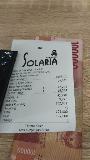 Pilih menu pakai scan barcode yang ada meja, cukup membantu dan tidak perlu lagi minta menu ke kasir. Nasi goreng Solaria terkenal sama enaknya, dan ternyata bener, enak banget. Waktu itu saya pesan nasi goreng teri cabe ijo, pedes banget gokil, walaupun pedes tapi tetep enak buat dimakan joss banget. Disolaria juga terkenal sama Chicken cordon blue yang gurih enak. Menu andalannya yaitu Nasi goreng, Kwetiau dan Chicken cordon blue. Tapi untuk ayam teriyakinya kurang enak waktu itu saya makan, ntah apa lagi kebagian yang kurang fresh ayamnya atau gimana. Tempatnya bersih, terang dan cozy enak dilihat. *Disclamer : Review ini saya buat dengan sejujur-jujurnya berdasarkan pengalaman yang saya alami ditempat ini dan diwaktu tersebut. Hasil review saya bisa saja berbeda dengan yg anda alami ditempat. Ini adalah sudut pandang saya secara subjektif. Terima kasih! Contact Person?...