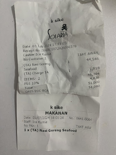 Read moreSaya kasih bintang 1 untuk para staff semua tidak bisa handling complaint, complaint dilempar ke anak traning. Anak training tidak bertanggung jawab untuk handling complaint walaupun semua dimata customer sama, perbaiki sikap untuk para staff semuanya saya sangat kecewaaaaaaa!!!!! Tidak ada kata minta maaf dan tidak ada tindakan, saya rasa anak training lebih profesional dari pada staff yang ada disana. Jadi saya mohon untuk manajemen solaria untuk di training lagi para staff untuk melakukan perbaikan sikap, tanggung jawab dan tidak boleh jahat seenaknya terhadap anak training!!!!!!!!!!!! BINTANG 5 UNTUK TRAINING YANG TADI HANDLING COMPLAINT SAYA!!!!!! SAYA RESPECT KARNA KAMU LEBIH PROFESIONAL DAN LEBIH LAYA KERJA DARI PADA PARA STAFF DISANA.