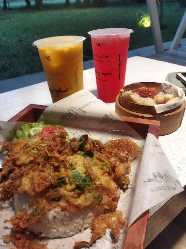 Read moreSuasana tempatnya sangat nyaman, sejuk dan asri karena banyak pepohonan yang semakin mempercantik tempatnya. Untuk pelayanan luamayan ok lah. Secara harga makanan dan minuman standart ya termasuk terjangkau. Tadi kesini pesen taro latte, brown sugar fresh milk, cireng dan udang rambutan. Untuk minumannya taronya enak rekomen sih tapi untuk brown sugar fresh milknya alangkah lbh baik jika brown sugarnya ditambah dikit lagi supaya lebih strong rasanya tadi nyobain cuma kerasa susunya doang jd gak begitu kerasa brown sugarnya. Dan untuk snacknya udang rambutannya enak tapi ukurannya kecil dan porsi dikit tp wajar jg sih cuma 10k saja. Dan untuk cirengnya crispy tapi sangat disayangkan sekali rasanya krg nampol dan kenapa gak ada sambal cocolnya ya? Jadi agak hambar klo dimakan gtu aja untung tadi pesen udang rambutan jd dpt saos dari situ. Saran sih dikasih tambahan sambal cocol biar gk hambar. Semoga kedepannya lebih baik...