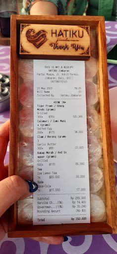 Read moreI came here with my friend (just the 2 of us). Eventho this place is at the end of Jimbaran Seafood area at Muaya beach, but I think this place is one of the best among others. Reasonable price (and frankly quite cheaper than others). I order a lot of of food (as u can see on receipt) and it's surprise us. The food that we order enough to feed 3 people (4 max if you are not a big eater) and this order already include rice, tumis kangkung and fruits, free as in complimentary when you order their seafood menu. They are not stingy for the complimentary. The rice & veggies that they serve enough for 3 person although we already told them to serve for 2 person. I think they serve it based on how many people on the table and also how many menu that you ordered. The place is clean, the staff are super friendly and nice (love them) and the taste of the foods itself are tasty. If they keep their standard as it is now, I won't hesitate to recommend this place for everyone to try it. No worries, you still get the beach view perfectly fine. It is at the end of the seafood resto chain, but because it's at the end, you'll get fewer crowd, so you can enjoy the beach view without too much people in your photos 😂 check their IG @hatikujimbaran if you want to see place and the foods. Please keep up the good work, don't change especially become so expensive or worst if become taste less. This place already win my heart. Will comeback again and...