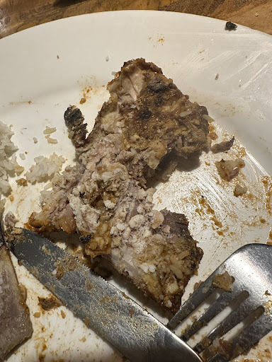 My beef ribs as seen in the picture was covered in white chunks of fat. If the ribs were properly and freshly cooked, those fats would likely be rendered and the meat tender. But these ribs are likely precooked then frozen, and only heated up when ordered. The thicker portion of the rib clearly did not have enough time in the oven and the fats was still a solid white sticky piece that stuck to my teeth, roof of my mouth and tongue when I ate it. Was really disgusting as I had to scrap my mouth clean with a tissue.