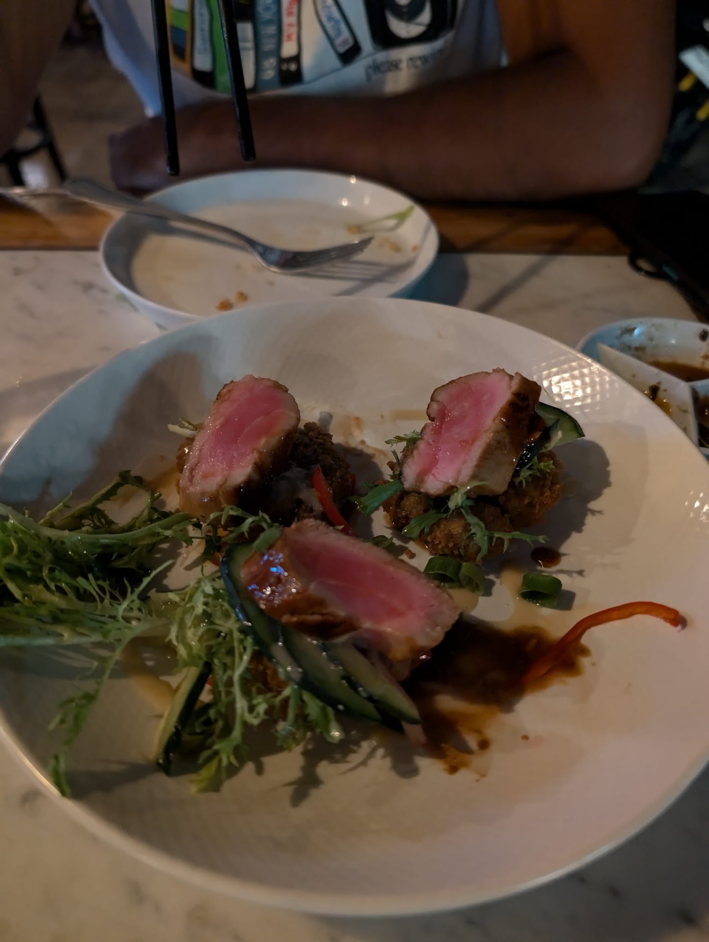 The flavors were superb, the tuna was cooked to perfection, they definitely use fresh ingredients, flavorful noodles, the turmeric and tamarind spritzer was so refreshing and the service was just great. Then, the cold coconut crème brûlée was the perfect dessert to finish a fabulous dinner. I will be coming back for more probably tomorrow 😍