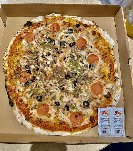 Read moreWe ordered firewood meat supreme pizza, which was ready in under 30 minutes! I've never had a pizza served this fast before. To be fair, we were the only patrons there at the time. The pizza is thin and crispy, best consumed when still warm, and is enough for 2-3 adults. There was a teenage boy who finished 1 full-sized pizza all by himself, however. The taste of the pizza was okay, it had all the ingredients listed in the menu: ground beef, ham, green pepper, onion, olive, cheese. With every bite, I tasted a different flavor, the saltiness of the cheese, the umami taste of the beef and ham, and the freshness of the pepper and olive. The traditional spicy pizza oil adds the subtle spicy flavor, loved it. I wish they had smaller-sized pizza so we - 2 persons- could try different kinds. We sat indoors, with the air-conditioner on but they kept the doors open (I wonder why) so it felt rather warm in...