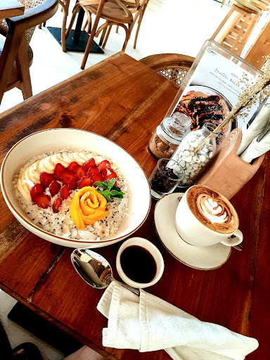 Read moreOurs Home is an amazingly great café-restaurant on the road leading to the Uluwatu Beach. It maybe a bit off the cliffs and without views, but more than makes it up with amazing food and service. The design aesthetics are Balinese. Under a wood and thatch roof with open sides, a bar with barstools in the centre and an open kitchen, this place is all wood tones. I loved the huge white curtains and venetian chik-blinds. The café is spacious and seats 80 to 90 people comfortably at peak occupancy. It was breakfast time, so I ordered a quinoa porridge and cappuccino. The menu is clearly labelled for vegan and gluten-free options. For most vegetarian dishes there's a vegan option - almond milk instead of regular milk, for instance. The porridge was delicious and substantial with fresh fruit on top. The cappuccino was one of the best I've had in Indonesia. I ordered another one, coz I liked it so much. Afterwards I relaxed and used the café's free wifi to browse while listening to a well-curated playlist of...