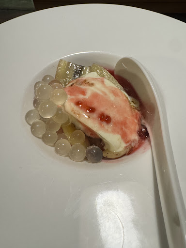 Dessert, cube fresh mango, with guava sorbet and lychee poppings. Taste is okay, but after a lot of savoury food, its very refreshing.