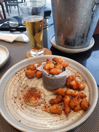 Read moreSeaside restaurant at the Hilton Nusa Dua. The restaurant affords a great view of the water as you dine next to the crashing waves. All the tables have a great view and general ambiance but the tables on the open patio are the best, especially for couples at nighttime (when there can be live music!) The service is excellent, the wait staff are very accommodating and take requests to alter dishes around food allergies. One of our members has a severe nut allergy and they remade one dish to be nut free for them. The food was great quality. I had never had fish skin crackling before but it was surprisingly good with the dip! The pizzas and wood fired prawns were delicious. The oysters (not pictured) were massive but a little lower quality taste-wise. Also note, you only get two beef sliders per order rather than the normal three at other restaurants. Overall, this was a great place to eat lunch at, for the ambiance, service and, most importantly, the food as well! Would recommend for anyone staying...