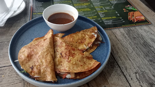 The main reason for the three star review is for our server, Alin, who was kind and attentive. I do not recommend the main food dishes based on what my husband and I tried however, this place may be better suited to enjoy a few drinks on a hot day. The ambiance is more like a cantina with open air seating. We were seated and given menus promptly. Overall, the main food dishes felt not well thought out with the exception of the extensive interesting starters. We had the mini quesadillas which had veggies inside and had some decent flavor. It was served with a dry garnish of shredded cabbage and carrot. A salsa or some guacamole with them would have been nice but we still enjoyed it as is. On that note, the Loaded Veggie Nachos were severely lacking in flavor (besides cumin) and could have seriously benefited from some red salsa. The chips did appear to be freshly fried and held up well. The fajita peppers and onions did not appear to be cooked (except whenever the cheese was baked) and the cheese was not cheddar cheese as stated on the menu nor did it have a salty taste as cheese should. As seen in the picture, a small amount of only whole beans were used which were also unseasoned. There was no guacamole and when asked, our lovely server quickly mentioned they ran out of guacamole but gave double pico de gallo. Unfortunately, the pico de gallo was spicy but had mostly green tomatoes and no flavor. The server later returned to mention they just made more guacamole, which I was thankful for, and brought some over. While this was appreciated, the guacamole also lacked salt or lime. Over all this dish was extremely unseasoned and dry. I recommend the owners/chefs add some salsa or seasoning to the veggies and beans to give it more flavor in the future. My husband tried the Veg Mie Goreng and Alin was very helpful in removing any sauces that were not vegetarian friendly. The flavor was decent however the fried noodles were softer than we have eaten previously in this dish and was not as satisfying to eat. As others mentioned, portion is large and prices are average so no issues here. I greatly appreciate restaurants that make an effort to add vegetarian items on the menu and I think with some modifications from the chefs, this could be a decent option for vegetarians/vegans. We did not mention any of this feedback to the server as we understand she was not making the food, but hope that some of our feedback is considered to improve the experience for...