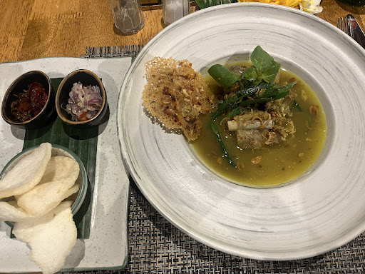 One of the best dining experiences I had while in Bali! The restaurant belongs to a hotel and has a relaxing and stylish vibe, with comfortable chairs and an inviting seating area. The food was delicious and I very much enjoyed both my starter and main. As the starter, I had the Jukut Balung (pork rib soup). The broth had a rich and savory taste and the meat was tender and fell off the bone. The dish was accompanied by prawn crackers and some garnishes, which complemented the soup well. For the main, I wanted to order the Ayam Betutu (chicken marinated in traditional Balinese spice mix) but they were out. I went for the Be Mepanggan Nasi Sele (grilled filet snapper fish with sambal and water spinach, with rice and cracked on the side) instead. It was excellent and offered a medley of intriguing and delightful tastes. The only small issue was that the fish bones were sometimes hidden, so I had to be a bit careful when eating the dish. The service was friendly but somewhat disorganized. Different waiters and waitresses took care of me, without always coordinating...