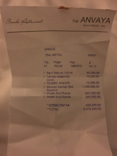 Ā Ā Ā Read moreKalau stay di anvaya beach resort, kalian akan dapat breakfast di resto ini. But i think its worth to paid to get your dinner here, or maybe just snack and beverage while enjoying the sunset. I was trying many of restaurant near this place, along the same beach, and i never found this -so worth to paid- resto. The price is equal with what you paid. ā„ Pasta Three Sauce nya enak, creamy, ga kering setelah dingin, porsi besar, harga 90rb++ worth to paid untuk sebuah makanan di club tepi pantai. Meat Pizza crispy, tipis, keju banyak, saos tomat ga berlebihan, ada 2 size, 25 dan 30 cm. harga 95rb++. Indonesian food a lil bit too expensive (150-300rb++) maybe cos its only foreign will order that of menu on this kind of resto. =D Cocktail drink +-120rb, average price, nice portion, nice taste. ā„ Various range of wine, well explained, they even offer me a sample before order in a bottle. Harga in a bottle 350rb-450rb++, so affordable, setara dengan resto2 di kayu aya yang jauh dari pantai. Disini, you got that ocean view! At night, you can still hear the wave sound. So romantic. Pantainya sepi, tidak seramai pantai di belakang discovery mall. viewnya bagus, karena km bisa lihat pesisir pantai barat bali. Its super long sunset. š Ps : the welcome bread its just average taste but big portion, served with balsamic oil and vinegar. I tried a bit, and prefer to get cracker in cheese dip š Maybe its because im not that hungry. But thank you anyway Sands-Anvaya, I've got a sweet memory here. Sure will...
