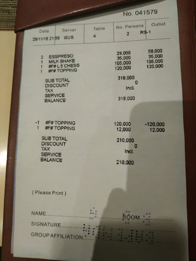 I've been there tonight and had a very very bad experience... I ordered a pizza which cost 105k rupias and extra topping which price is 12k. Then I ordered a double expresso (29k). I was surprised when I saw the total of my bill (318k). They added a 0 to the price of the extra topping, and they charged 2 expressos because I asked for a double short. They made a correction on the topping but didn't want to change the price of the expresso. I have never payed that price for a coffee. Even on the French Riviera ! This is the first time that I see that. Of course, I don't recommend the place, and will never go...