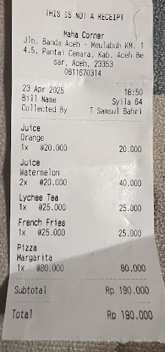 Ā Ā Ā Read moreMaha Corner is one of the best place to chill in Aceh Besar area. The place is so serene, the design is very well thought off. Itās a perfect place for relax, reading books, or daywandering. Itās a perfect place for instagram generation. But all those things seem like a facade when you compare to its service. The menu is very lacking. You arenāt given much variety of what food and beverages you can order. We ordered french fries and it took almost half an hour for the dish to be ready. Their hospitality were unpleasant. No smile and typical Indonesian warm welcome. You will get better services and hospitality somewhere else than here. I wonder if the services are better if the customers are Caucasians. Whatās more shocking, when we were pulling out our cark, the parking guy asked Rp5000 for parking...