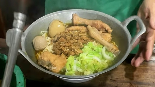 Dalam satu wajan, mie disusun rapi bersama ayam bumbu kecap melimpah, telur bacem, bakso, dan pentol tahu. Semua disiram kuah kaldu ayam kampung yang panas dan gurih.