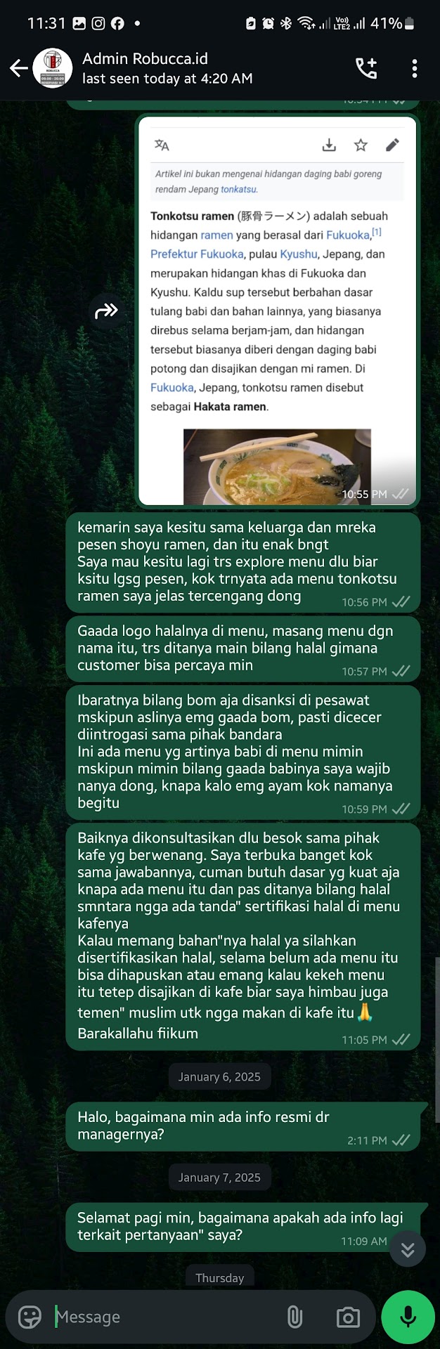 Read moreMUSLIMS PLEASE READ THISâŒïž Aku sarapan disini ama keluarga kakakku (dia, suami, anak 1.5thn). Krn sarapan aku pesennya italian salad sama double cream matcha. Kakakku yg sausage breakfast ato apa namanya lupa, nah suaminya beli shoyu ramen, anaknya dibeliin cemilan kntang goreng. Kita coba makanan masing" nih, dan jujur ramen yg dipesen suami kakakku enak banget kaldunya. Aku tandain lah next time kalo mau ramen kesini lagi aja, harganya juga standar. Tibalah bbrp hari pas mau kesini lagi aku liat menu dirumah biar pas di kafe lgsg pesen. Aku cermatin lagi kok di pojok menu ramen (gambar terakhir) ada TONKOTSU RAMEN. Kek ga asing tp seingetku ini pernah masuk konten warning buat muslim di luar negeri buat aware ttg istilah" menu haram di bahasa asing. Searching google dan bener dong itu tuh Ramen Kaldu BABI. Jujur kesel, gedek, kecewa smuanya campur aduk. Krn jujur aku pernah makan bakmi ke PIK, pilih warungnya yg asal ada tulisan halal aja krn mostly disana jualan ada menu babi. Bakminya emg enak banget, bakmi terenak yg prnh kumakan. Tp abis makan kek ngerasa nyesel krn ga mastiin itu dia ada sertifikatnya halal nggak. Kalo asal klaim kan gampang aja, di prosesnya gatau kan kalo keciprat ato alatnya kontam, makanya fungsi sertifikasi halal disitu. Kalo ada kan udh pasti aman. Bakso afung aja ada cust asal makan disitu pake krupuk babi dia musnahin smua itu mangkuknya krn gatau mangkuk yg mana yg dipake cust tadi. Sekrusial itu dan kafe ini seenaknya masang menu yg jelas" namanya kalo ditranslate yaitu RAMEN KALDU BABI, dan klaim bahannya halal tanpa dasar yg valid. Itupun di menu gaada footnote atau keterangan apapun yg menjelaskan kalo menu itu pake bahan halal. Aku komplain udah baik" tapi dari manajemen kafe terkesan nge-gampangin. Komenku dihapus berkali", liat aja di foto berkali" aku komen di postibgan yg sama. Bahkan sekarang IG ku diblock krn aku spam komen buat peringatin Muslim yg lain. Di agama Islam kita dianjurkan utk lebih baik hati" drpd melakukan hal yg belum jelas halal haramnya. Makan di tempat yg ada khamrnya (minuman) aja ga boleh apalagi ini yg jenisnya sama" makanan, di prosesnya pasti lebih besar cross contaminationnya. Setelah insiden aku makan di PIK aku baru dpt ilmu itu dan skrg kyk ketampar lagi sama perkara kafe ini. Dikomplain baik" ga direspon dgn baik dan IG ku malah diblock. Semoga dgn reviu ini lebih banyak Muslim yg MENGHINDARI...
