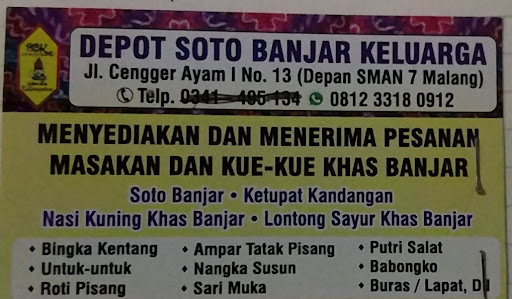 Untuk seputaran malang rasanya Soto banjar ini yang paling mirip rasanya dengan yang dibanjarmasin walau agak sedikit disesuaikan dengan taste jawa kata yang punya ( orang banjar juga)... Nasi kuning dan lontong sayur bumbu habang sambal Bali nya yang agak gak sama... Namun cukup enak... Mesti telpon dulu, (lihat di photo kartu namanya ya guyz...) cek ada haruan gak.... soale gak tersedia setiap hari jar... Plus tersedia wadai (kue jajan pasar) khas banjar mulai dari bingka kentang sampai putting selat n untuk2 😁... cocok bgt deh buat Mengobati yang kangen...
