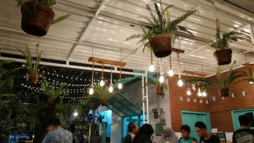 Kita bahas dulu nih dari segi Interiornya, diisi dengan sejumlah meja dan kursi dari papan kayu. Di salah satu sisi dibuat serupa situasi ruang tamu zaman dulu yang kesannya klasik gitu pokoknya. Dua buah ayunan yang cocok dijadikan tempat berfoto melengkapi sisi lainnya dan yang terakhir adalah yang terpenting. Apa lagi kalau bukan berpot-pot tanaman hijau. Mulai dari semua bagian tembok luar, langit-langit kafe, hingga bagian bawah alias di tanah tempat seharusnya pot-pot itu berada.